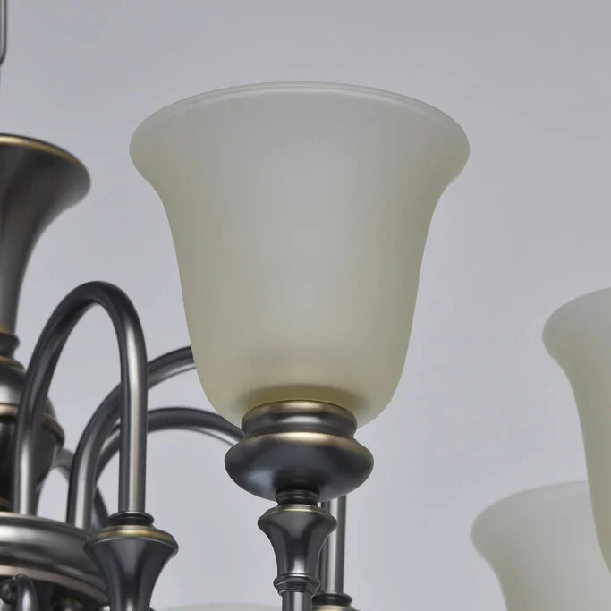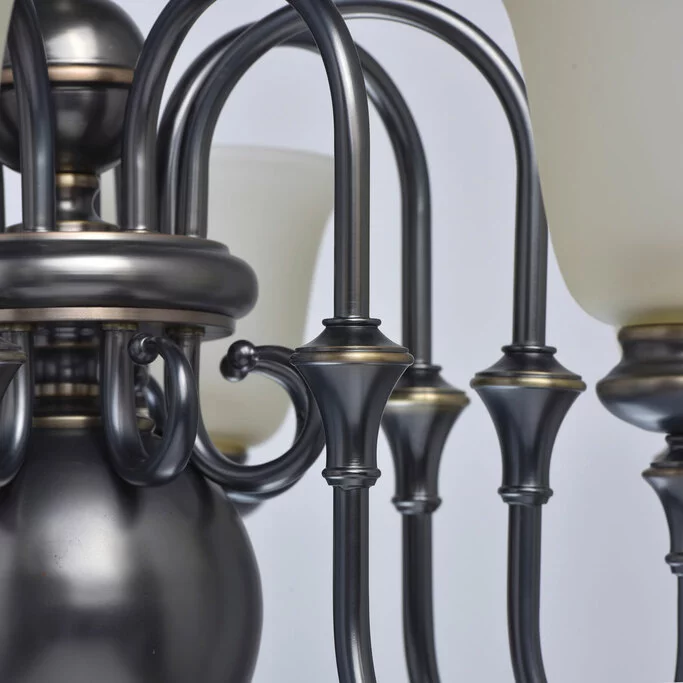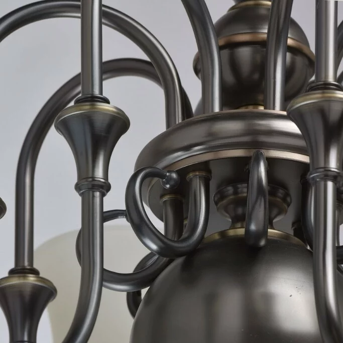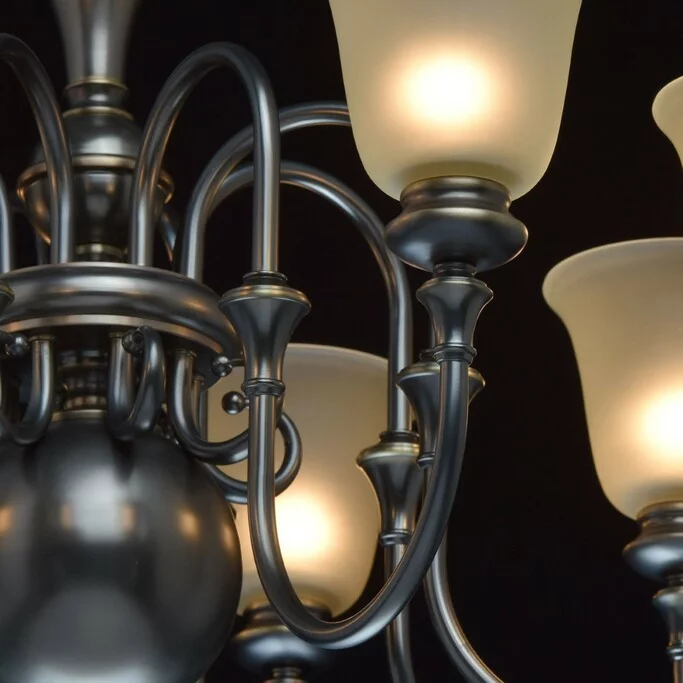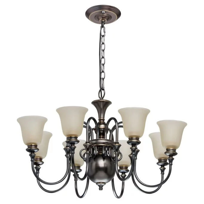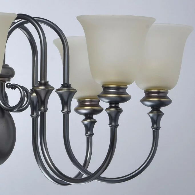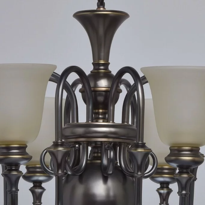 Люстра из коллекции «Даллас», выполненная в стиле современной классики, станет отличным украшением современного интерьера. Металлическое основание цвета черненой бронзы дополнено легким матированным эффектом и оригинальным винтажным декором. Под стать основанию – грациозная центральная часть, подчеркнутая элементом в виде сферы. На фоне основания особенно выгодно смотрятся круто изогнутые рожки и лаконичные стеклянные плафоны матового бежевого оттенка.