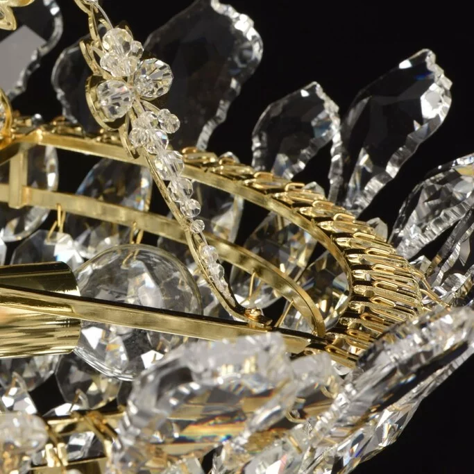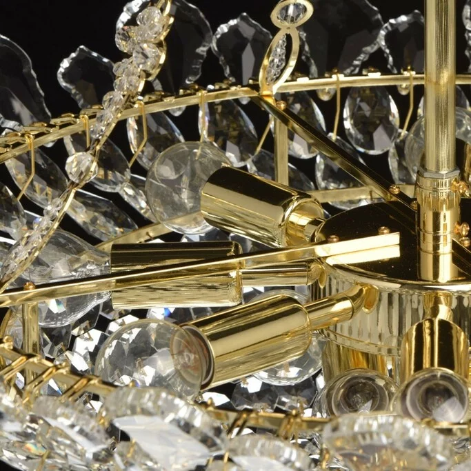 Прекрасная люстра из коллекции «Патриция» восхищает своим роскошным воплощением. Основание из металла золотого цвета гармонично сочетается с широкой декоративной чашей и элементами из прозрачного стекла – создается по-настоящему величественная и торжественная композиция. Большое количество хрустальных подвесок подарит неповторимую игру света и праздничные переливы. Есть два варианта светильника – с потолочным и подвесным креплением. Выбирайте в зависимости от размеров помещения и высоты потолков.