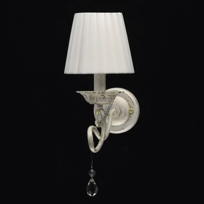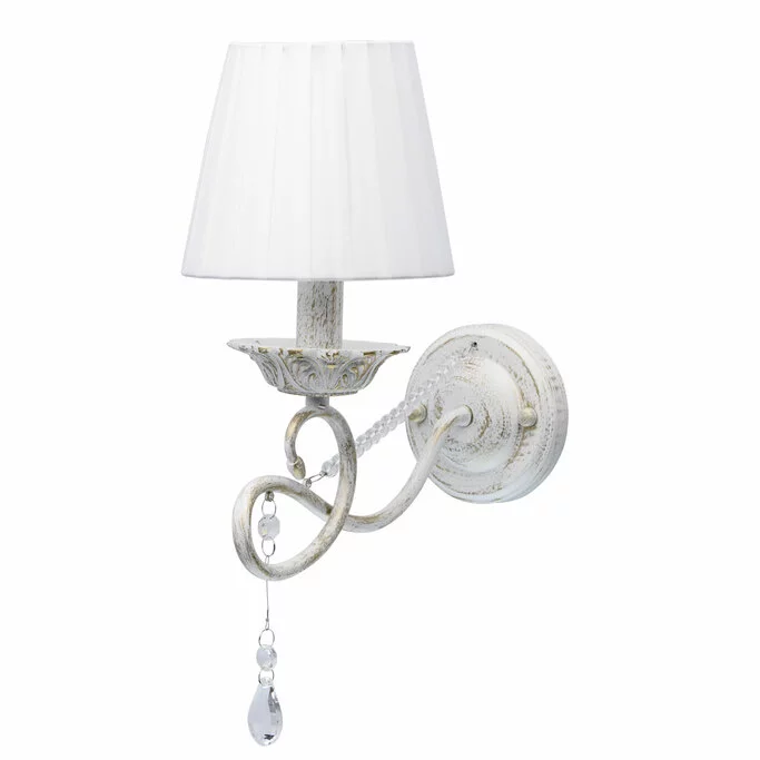 Бра из коллекции «Виталина» - это классический светильник, выполненный в соответствии с современными трендами. Металлическое основание классического белого оттенка подчеркнуто эффектом патины. Нежный тон гармонично дополняет тканевый гофрированный абажур белого цвета. Грациозный изгиб рожка выглядит ещё более изящно благодаря ниспадающей ните стеклянных бус. Драгоценные хрустальные капли придают композиции завершенность.