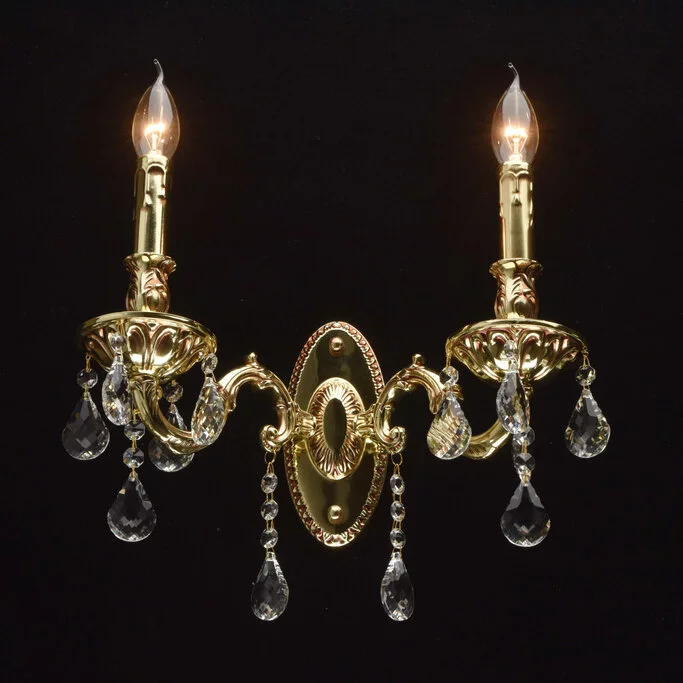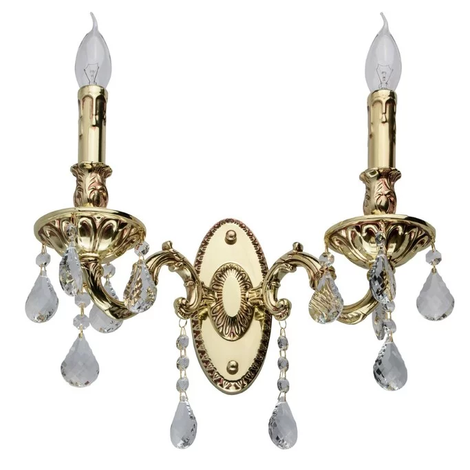 Бра из коллекции «Свеча» - это классическая красота и грация. Металлическое основание выполнено в золотом цвете и дополнено эффектом патины кофейного оттенка – получается очень интересное и эффектное сочетание. Плавный изгиб рожка подчеркнут источниками света в виде свечей. Завершает композицию богатый декор: округлые подвески из прозрачного хрусталя создают обворожительную игру света.