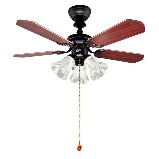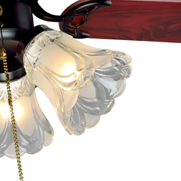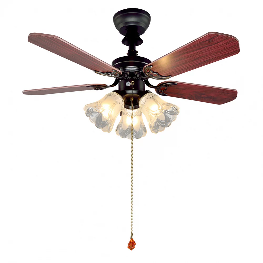 Люстра-вентилятор выполнена из металлического каркаса черного цвета со стеклянными плафонами. Можно включать с помощью сонетки.