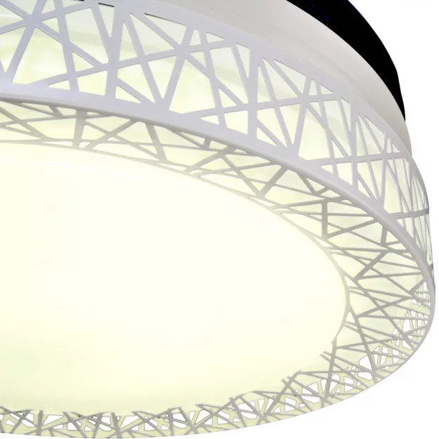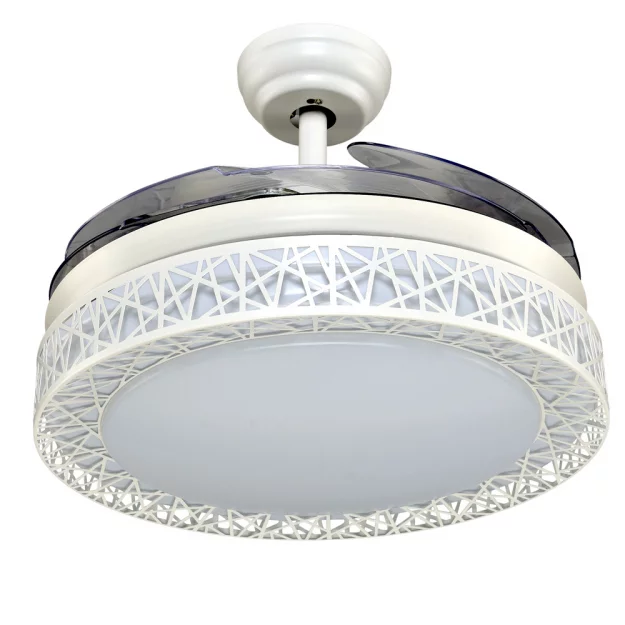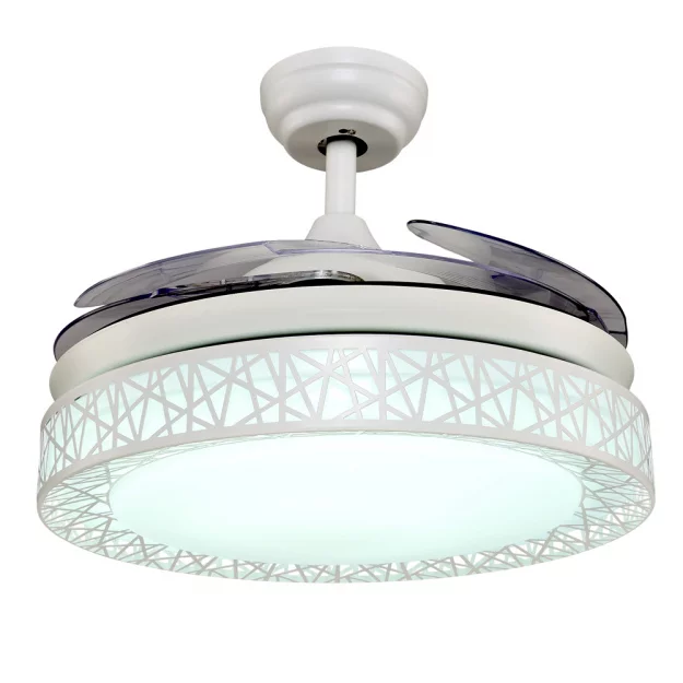Люстра-вентилятор выполнена из металлического каркаса белого цвета с плафоном из ударопрочного акрила. Имеет 3 режима включения. Управление с пульта. Лопасти вентилятора складываются в выключенном состоянии.