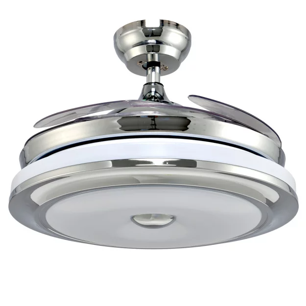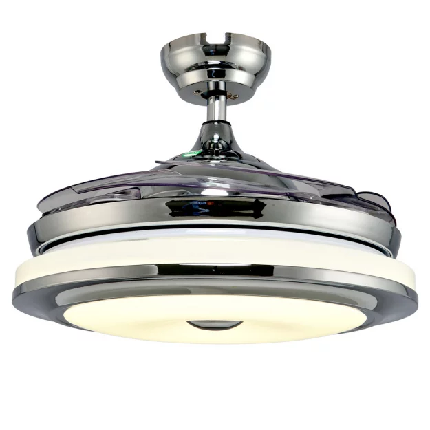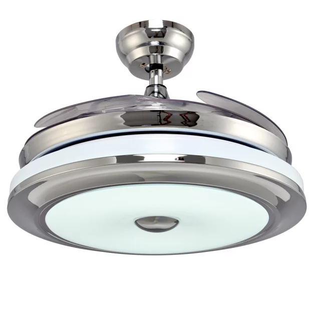 Люстра-вентилятор выполнена из металлического каркаса в цвете хром с плафоном из ударопрочного акрила. Имеет 3 режима включения. Управление с пульта. Лопасти вентилятора складываются в выключенном состоянии.
