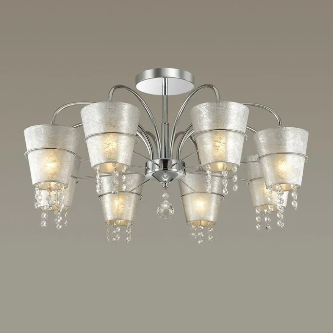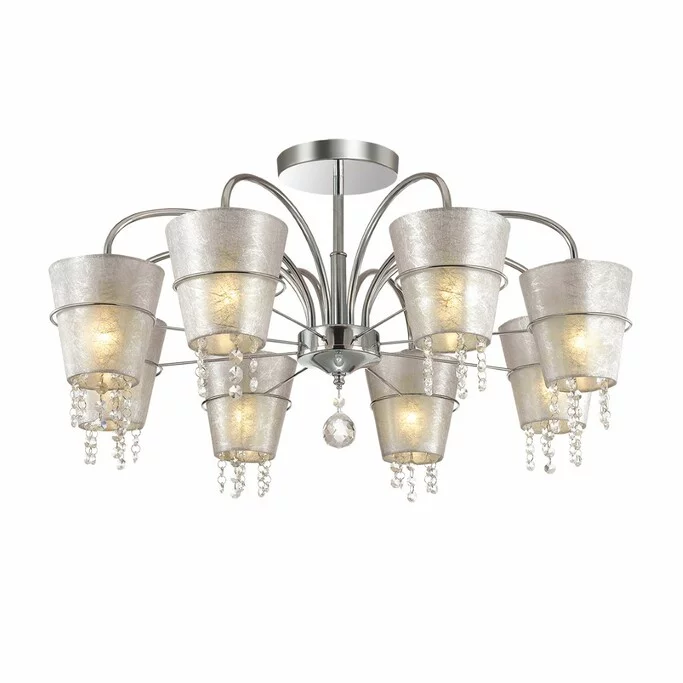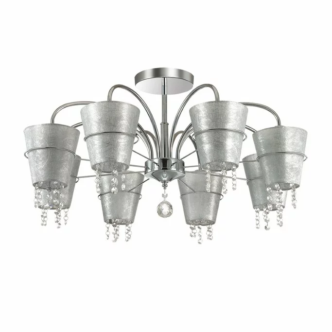 Серию Buonaprana отличают необычные перевернутые абажуры из ткани серебристого цвета и свисающими из них хрустальными подвесками. Металлическое основание покрашено в цвет хром. Такое сочетание смотрится необычно, свежо и очень оригинально