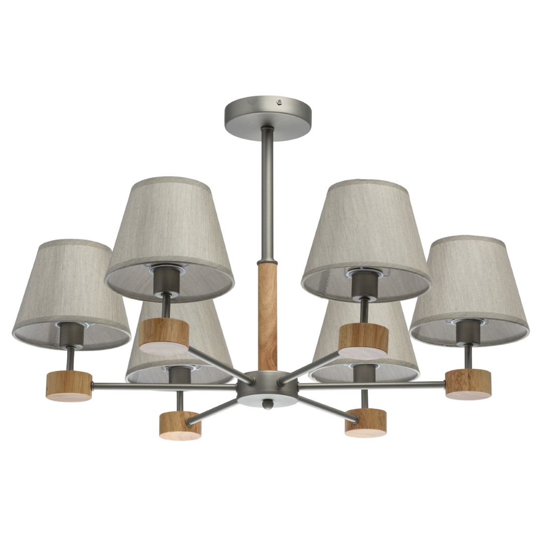 Эксклюзивное сочетание материалов, элегантность и сдержанность привлекают в этой люстре. Металлическое основание цвета матового никеля подчеркнуто оригинальными декоративными вставками из натурального дерева – создается своеобразный контраст, привлекающий внимание. Тканевые абажуры серебристого оттенка идеально дополняют композицию. Такой светильник будет гармонично смотреться в интерьерах с различными стилевыми решениями: эко, скандинавский стиль, ар-деко, модерн.